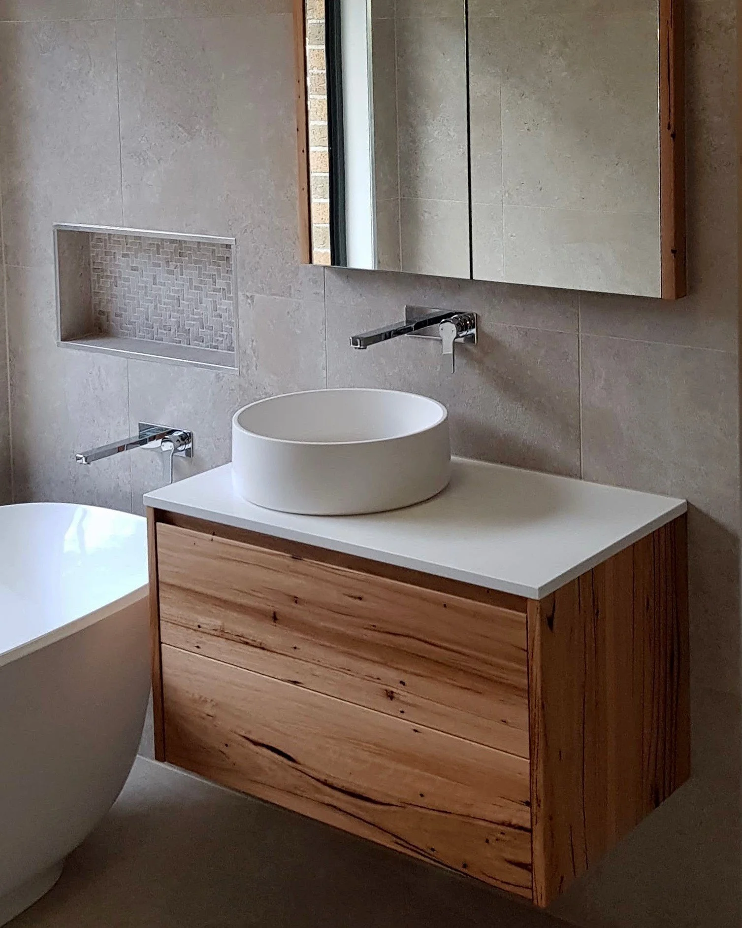 The “Montana” combines your choice of stone and wood to create the perfect piece for your bathroom. Pictured here in Recycled Messmate with a Caesarstone “Snow” top.